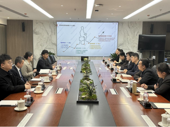 秦永波对严碧峰一行来集团总部走访交流表示热烈欢迎,并介绍了公司的发展背景和方向。哈啸飞详细介绍了行业发展、人才招聘需求及职业发展前景。张怡从岗位招聘角度介绍了企业文化和职业生涯发展。