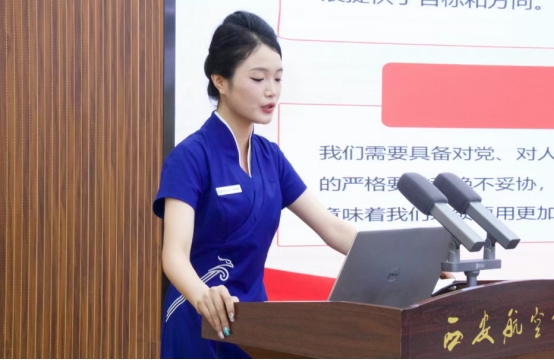 本次员工团干部决赛分为微团课讲授和“我与支部共成长”主题分享。姜旭星同学以“以民航精神绘青春之底色”为主题,开展了一次微团课。她以生动的话语将主题分为四部分来分享,最后以向风而行,起落平安为结束语。
